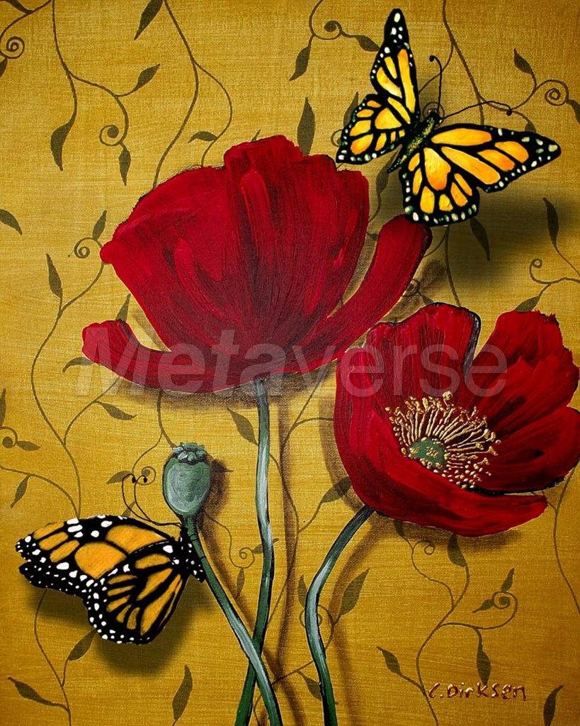 Title: Red Poppies With Yellow Butterflies