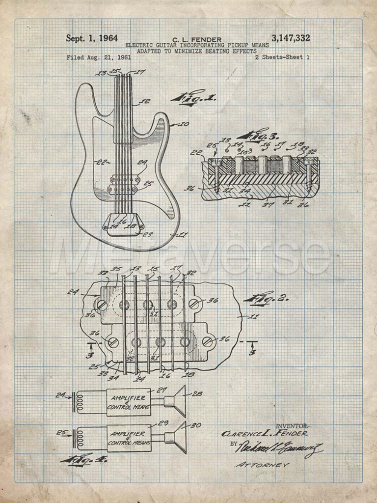 Title: Electric Guitar Patent - Antique Grid Parchment