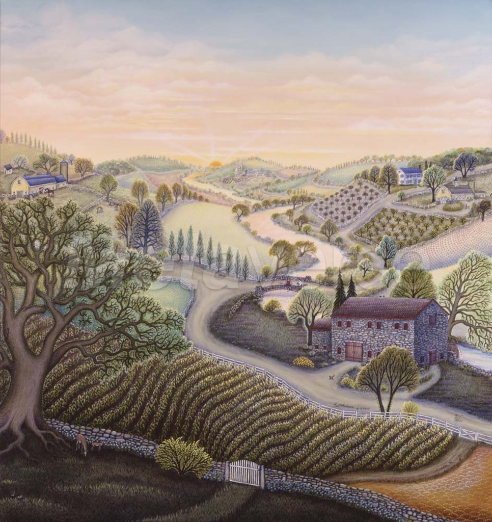 You are viewing a Serigraph print. Fine artists create serigraphs in limited runs by applying layer upon layer of pigment to the print surface by pressing it through a mesh screen containing a stencil. The complex and lengthy process commonly uses inks for pigment and stencils made of a variety of materials. Because of the nature of the process each serigraph is unique.